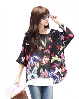 Demarkt Women’s Scoop Neck 3/4 Sleeves Bohemian Style Loose Shirt Tops Colourful Butterfly Print Chiffon T- Shirt Black Size L
