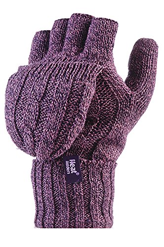 Ladies 2.3 tog Thermal knitted Heat Holders FINGERLESS Mitten Cap Gloves Purple