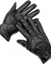 Boxed ladies black leather gloves. Practical soft leather uppers with a cosy fleece lining make these great gloves perfect for cold, wet, winter weather. These gloves feature three long panels on the backs of the gloves with top stitching and a stud fastening, half-elasticated cuff. Also great for winter driving! Ladies size: small/medium. Shell: 100% Leather, Lining: 100% Polyester.
