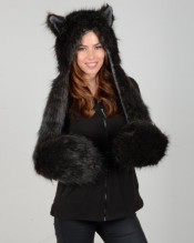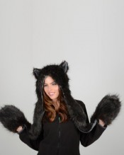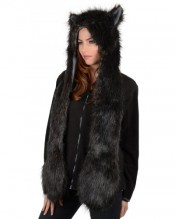 Ladies Black Faux Fur Husky Wolf Style Super Warm Animal Hat with Attached Scarf
