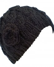 Ladies Cable Knit Beanie Hat with Crochet Rose BLACK
