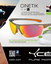 Next to their good looks, the Cinetik sunglasses have a lot more to offer: extremely light 20 g nylon frame and adjustable gummed non-slip nose-pads for high wearing comfort. Vented glasses to avoid sight-restriction due to condensation. Like other Cebe models, Cinetik sunglasses can easily be adapted to your visual acuity by clipping on optical lenses. Cinetik sunglasses come with 3 spare glasses and guarantee optimal sight in all weather conditions.