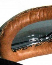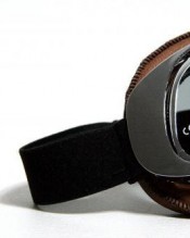 The goggles are made out of real leather. This model has a chrome-coloured, plastic, frame.