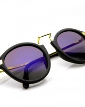 Classy round p-3 shaped frame made from black acetate with a prominent metal nose bridge that projects in front of the frame. Features metal arms and metal hinges. Made with an acetate and polycarbonate UV protected lenses.