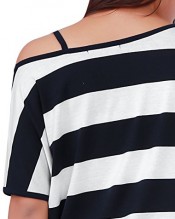 Horizontal Striped, Asymmetrical Neck, Off Shoulder, Stretchy, Casual Shirt;
