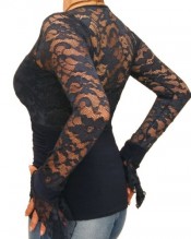 A clingy top made from stretch lace and slinky fabric. Ruched panel beneath the bust and long sleeves with bell shaped cuffs.