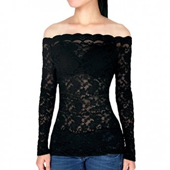 DJT Women’s Sexy Lace Off Shoulder Long Sleeve Casual Tunic Slim Fitted Blouse Tops Basic Coat Shirt T-Shirt Black