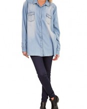 Long fitted sleeved faded sand blasted wash blue denim collared shirt with eight button front press stud fastening, two patch chest pockets and faux pearl yoke embellishment.