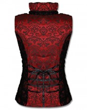 Stunning Victorian Steampunk style sleeveless blouse in gorgeous red polycotton fabric with damask pattern and black lace trim. Beautifully fitted featuring gathered collar and layered front detail, comprising tiers of ruffled fabric and black lace for a frilled jabot effect, with matching ruched black floral lace side insets. Front button fastening with ornate black rose buttons, complimented by beaded satin roses to the lace contour trim. Finished perfectly with adjustable ribbon corset lacing to the back for the perfect fit! 53% polyester, 44% cotton, 3% spandex.