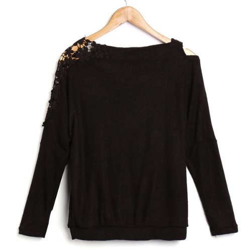 Ladies Off Shoulder Floral Crochet Long Sleeve Knitwear Jumper Hollow Tops Sweater Black 10