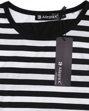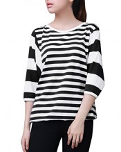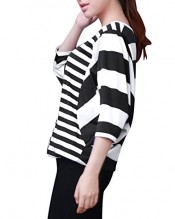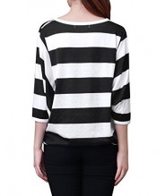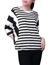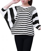Ladies Scoop Neck Striped Pullover Bat Sleeve Shirt Top Black White M