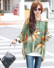 1 * Fashion Floral Print Round Neck Batwing Three Quarter Sleeve Women”s Loose Chiffon T-shirt Blouse – Free Size (Green)