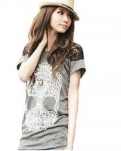 New Korean Fashion Style Womens Casual Skull Lace Short Sleeve Loose Shirt Blouse Top (M(UK8-10), Grey)