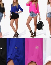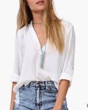 New Spring Womens Fashion Casual V-neck Roll Up Sleeve Chiffon Shirt Blouse Top