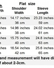 Shoulder width:42cm/16.5inch;Bust Girth:102cm/40.2nch;Total Length:71cm/27.9inch;Sleeve Length:65cm/25.6inch