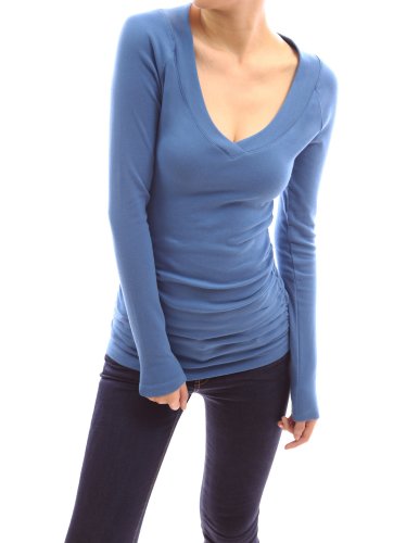PattyBoutik Cotton Blend Raglan V Neck Long Sleeve Ruched Sides Stretch Casual Top (Blue 8/10)