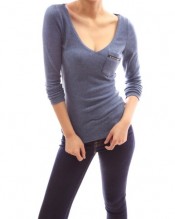 Cotton Blend Textured V Neck Pocket Long Sleeve Stretch Fitted Tee.