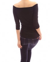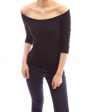 PattyBoutik Off Shoulder Ruched 3/4 Elbow Sleeve Stretchy Fitted Casual Top (Black 12)