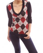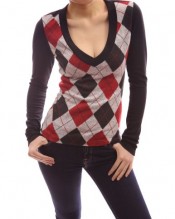 PattyBoutik Smart V Neck Checkers Long Sleeve Knit Top (Red 14)