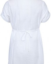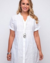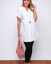 Plus size white dobby shirt with a pretty sequin and embroidery detail to the front. Has a band neckline, short roll-up sleeves with tab and button fastening, a thin fabric tie to the back, 7 button fastening down the front and small splits to both sides of the hem. Made from 100% cool cotton, wear this shirt with denim crops for a comfortable casual look.