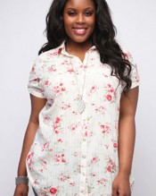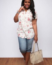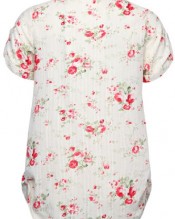 Plus size cream shirt with an all over coral pink and green floral print, a bias cut bib front and rolled short sleeves with metal ring fastening. Featuring white metal poppers to front placket and adjustable rolled side seam with tab and popper detail. Made from 100% cotton for extra comfort and can be worn with denim crops for a casual look.