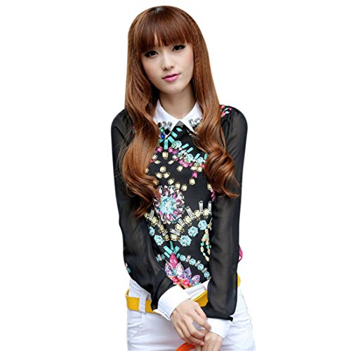 Ukamshop Womens Lady Vintage Long Sleeve Sheer Tops Shirt Chiffon Blouse (XL, Black)