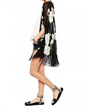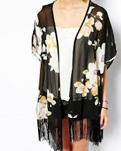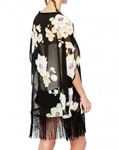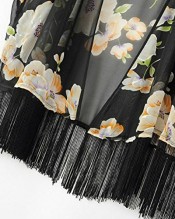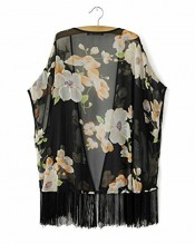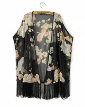 Women’s Batwing Sleeve Floral Print Tassels Fringed Chiffon Loose Kimono Cardigan Jacket Coat Tops (L, Black)