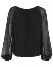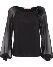 Silky feel jersey fabric, sheer chiffon long blouson sleeve, elasticated off shoulder neckline and hemline, box shape, detachable corsage flower included.