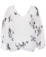 Say it with a butterfly this season and endure symbolic transformation into an outer beauty. This heavenly chic top, will hit the spot with its delicate and super sassy design. Sleeveless, stretch poly vest insert, butterfly print chiffon overlayer, cape shape kimono sleeves, low cut V-front and back, gathered waist, mirror metalwork to front.
