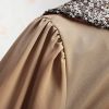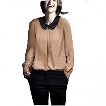 Womens Sequin Peter Pan Collar Long sleeve Chiffon Loose Shirt Blouse Tops Beige 12
