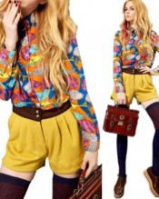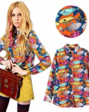 Zehui Vintage Women’s Long Sleeve Fish Print Chiffon Button Down Shirt Blouse Tops UK12