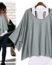 Zicac 2PCS Women Batwing Casual Short Sleeve Loose Tops Blouses T-shirt And Vest Size 8 10 12 14 (Khaki shirt+white vest)
