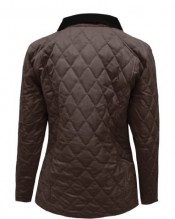 Classic jacket has a zip fastening with buttoned front.Two front pockets and black cord collar. Lightweight ladies padded quilted jacket.