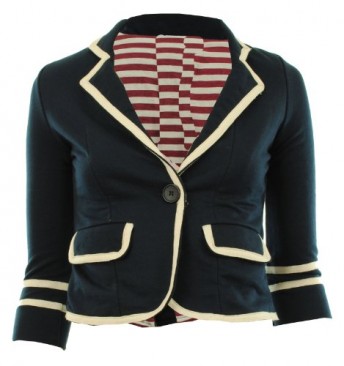 ***Crop Length Blazer with 3 by 4 Arm Length***; Sailor or Nautical Inside Lining; Two Front Pockets with Flaps; Cream Piped Lapels, Hems and Pocket Flaps; One Button Fastening; Single Breasted Blazer; Length (Shoulder to Hem) – 49 cm or 19 inches; Sleeve Length – 45 cm or 13.5 inches Wash 30; 50% Polyester 50% Cotton