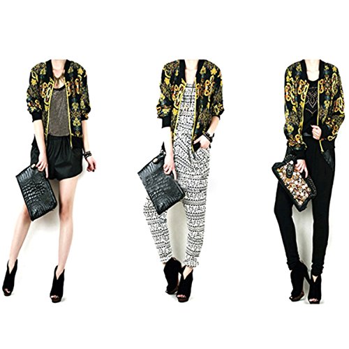 New Women Yellow Floral Chiffon Biker Motocycle Bomber Baseball Jacket Blazer Coat
