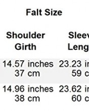 Bust girth:92cm/36.2inch; Shoulder width:38cm/14.9inch; Sleeve length:60cm/23.6inch; Total length:51cm/20.1inch