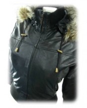 Womens Black Hooded leather bomber jacket with fur collar # M1 (14)