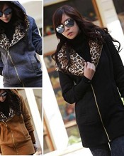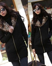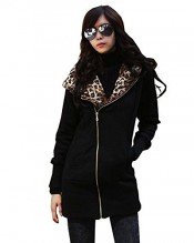 Women’s Spring Autumn Cotton Blend Plain Hooded Lapel Zip Up Leopard Jacket Coat (L, Black)