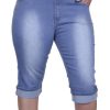 You are looking at a pair of crop leg denim jeans. The fabric is stretchy and has been washed to a pale blue, with fading on the legs. The front has 3 pockets with silver colour rivets. The back has 2 pockets with stitch detail and tiny diamante stones. The waist band has belt loops, and a silver colour metal stud button. The bottoms are turned up to show a contrast. These are a fitted cut on the hips.
