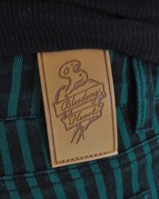 Jeans are in an all over black and green striped pattern with Bleeding Heart brand patch on waist
