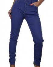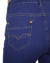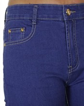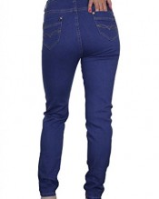 You are looking at a pair of full length denim jeans. The fabric is stretchy and has a smooth finish. The front has 3 pockets with gold colour rivets. The back has 2 pockets with stitch detail and matching rivets. The waist band has belt loops, and a gold colour stud button. These have yellow colour contrast stitching. These are a tight fit with slightly tapered bottoms.