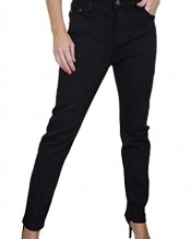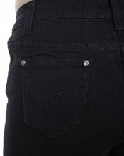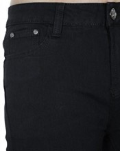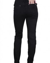 You are looking at a pair of full length denim jeans. The fabric is stretchy and has a smooth finish. The front has 3 pockets with dark silver colour rivets. The back has 2 pockets with stitch detail and matching rivets. The waist band has belt loops, and a dark silver colour stud button. These have black colour stitching. These are a tight fit with slightly tapered bottoms.