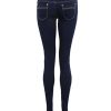 Refine your denim adding finesse satin touch to your look. Dark wash stretch denim, low rise, classic 5 pocket styling, chain trim to satin animal printed tie belt, skinny, petite fit.
