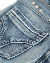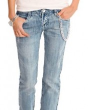 Women’s jean in destroyed look. Low-rise five pocket jeans with enlarged noticeable seams below pockets. Enlarged seams can be found at the back of waistband (with small button appliqués) and at hip pockets as well. Chain with key (included in scope of supply) make trousers look more interesting. Made of 67% cotton, 30% polyester and 3% spandex. Measures (all applied on size 6/S): Length of inner leg: approx. 79cm. Leg width (bottom): approx. 17cm Leg width (top): approx. 25cm. Machine wash at 30°C. Please note: Trousers run true to size! Model is wearing size 6/S (height: 171cm and waist circumference: 60cm).