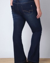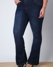 Plus Size Mid blue boot cut jeans with x2 front pockets, x1 coin pocket, and x2 back pockets with stitching detail to pockets.