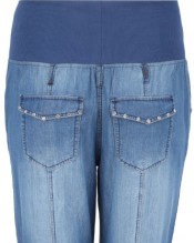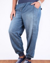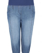 Plus size mid blue harem jeans with a darker blue ribbed 15cm waistband and ribbed cuffs. Has large pockets to the back and front with stitch and stud diamanté detail, imitation fly, panel detailing, and fading to the legs. Made from a lightweight denim these are great for a comfy weekend style.