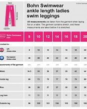 Black ankle length ladies swim leggings from Bohn Swimwear. These black swim leggings cover all the way down to the ankle. They have an elasticated waist. Designed specifically for swimming. Made in a quick drying, and chlorine resistant fabric. The fabric also has UPF 50+ protection against UV rays from the sun, making them suitable for sun protection. Ideal for everyday swimming these leggings are soft on the skin and designed to fit to the body. Team the leggings with one of the Bohn swim tops. In size 8 to size 20