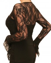 A clingy top made from stretch lace and slinky fabric. Ruched panel beneath the bust and long sleeves with bell shaped cuffs.