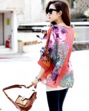 Bohemian Floral Batwing Sleeve Plus Chiffon Blouse Womens Loose Off Shoulder T-Shirt Tops Red
