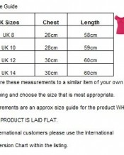 Approximate measurement for the product when laid flat are 8 Chest 26cm Length 58cm; 10 Chest 28cm Length 59cm; 12 Chest 30cm Length 60cm; 14 Chest 31cm Length 60cm.